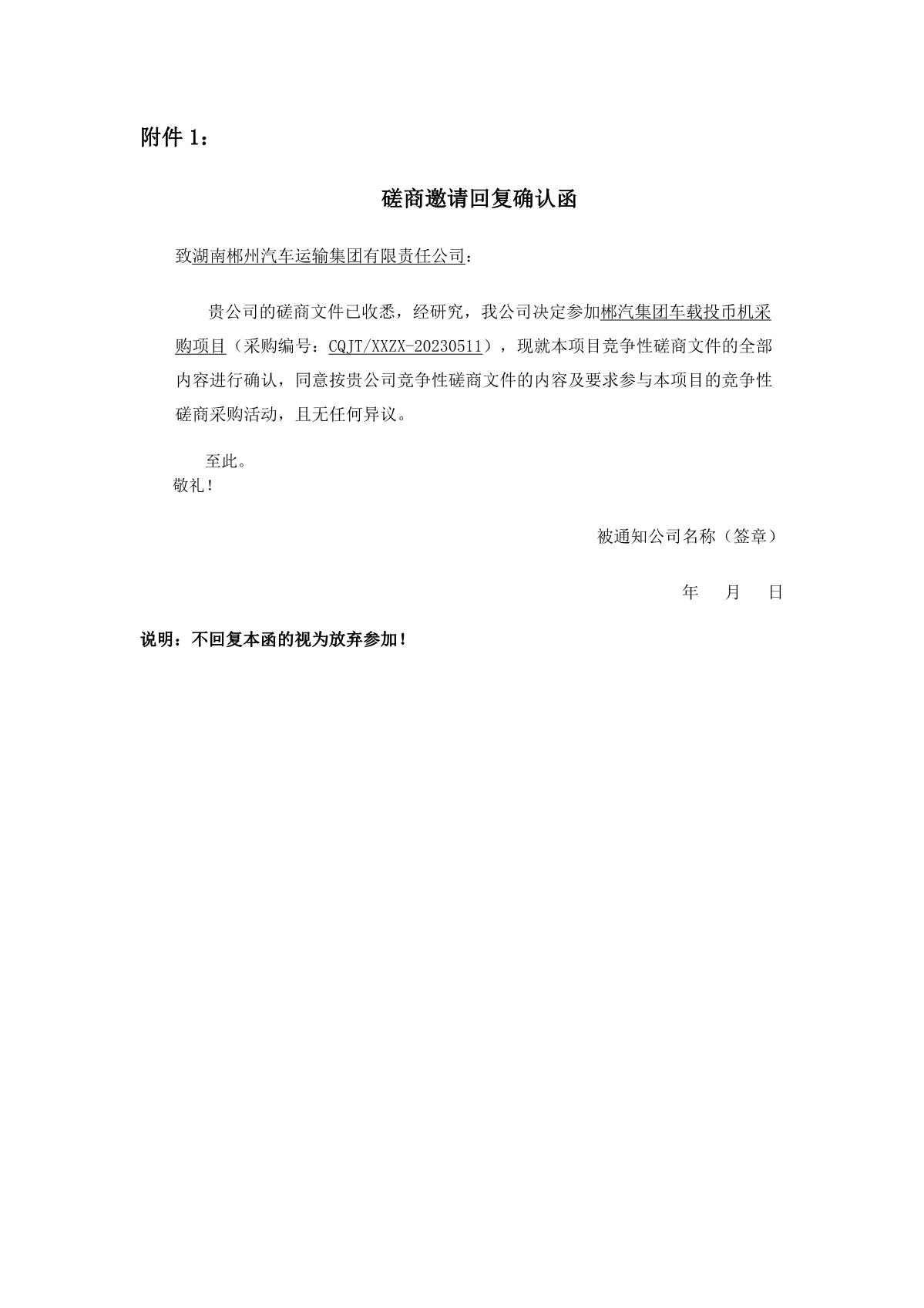 你單位收到磋商文件后,請(qǐng)于2023年5月26日17時(shí)前來(lái)函確認(rèn)是否參加競(jìng)爭(zhēng)性磋商采購(gòu)活動(dòng)。若未收到你方書面確認(rèn),將視為你方已放棄參加本項(xiàng)目競(jìng)爭(zhēng)性蹉商采購(gòu)活動(dòng)(格式見(jiàn)附件1)。